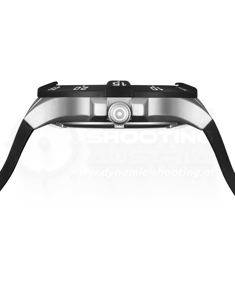The GW-15-6-22 combines iconic GLOCK design with reliable everyday usability. A black stainless steel case (43mm), framed by a black stainless steel case back, and a black silicone strap with a grippy RTF texture ensure a tactical look and a secure fit. Sapphire crystal, a rotating bezel, and highly luminous Swiss Super-LumiNova® make the watch robust, easy to read, and ready for action – whether in the office, on the range, or on a weekend trip!