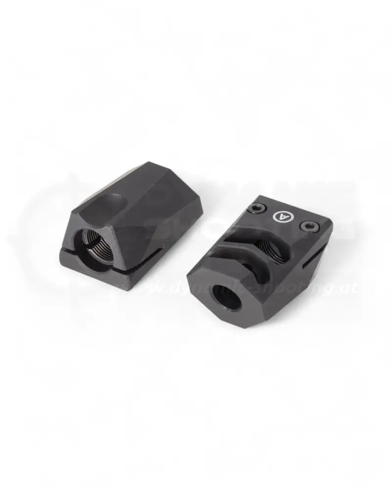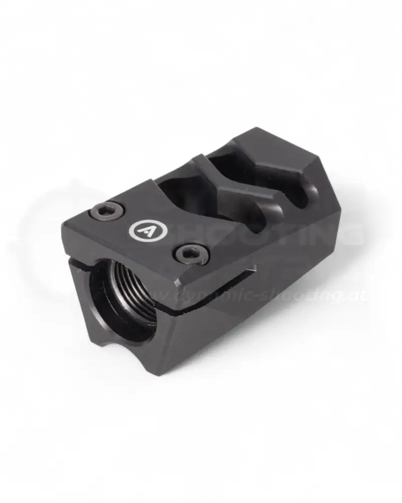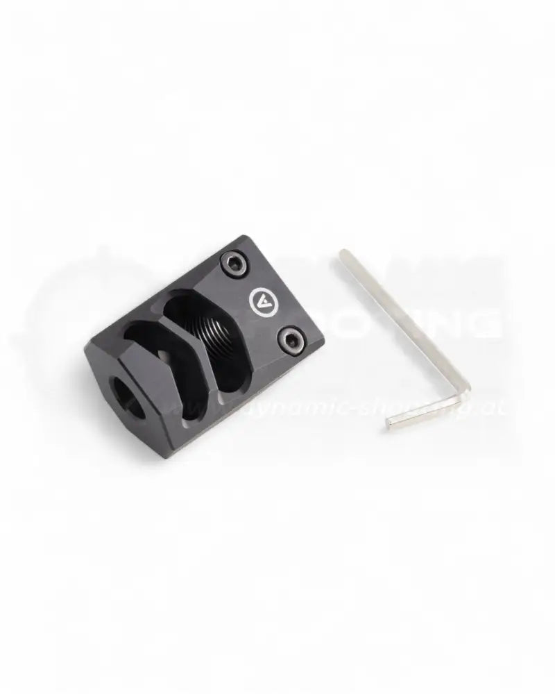 The Armanov 9mm compensator for handguns noticeably reduces recoil and muzzle rise, allowing for faster follow-up shots and a significantly more stable sightline. Thanks to its 2-port design and precise gas redirection exclusively upwards, it's the ideal upgrade for sport and training pistols with threaded barrels.