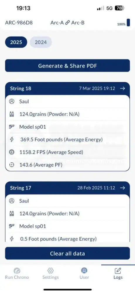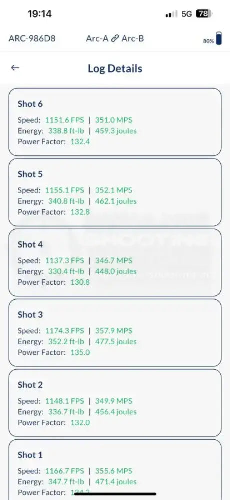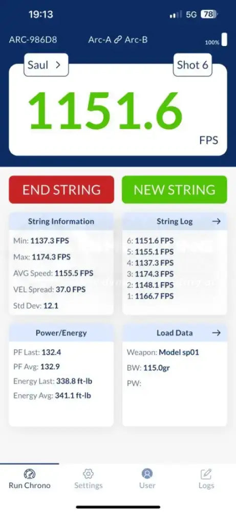 The connection to the ARC Chrono app (iOS & Android) is wireless via Bluetooth 4.0. The app enables live display of shot data, including velocity, deviation, energy, and power factor. Users can create shooter profiles, save measurement sessions, and automatically record other environmental data such as temperature and air pressure.